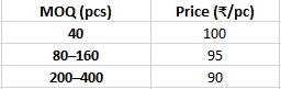 40pcs, 80pcs, 120pcs, 160pcs, 200pcs, 240pcs, 280pcs, 320pcs, 360pcs, 400pcs |