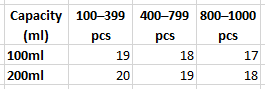 100 / 100ml / Clear | Black - Rs. 1,900.00 100 / 100ml / Clear | White - Rs. 1,900.00 100 / 100ml / Black | Black - Rs. 1,900.00 100 / 100ml / Black | White - Rs. 1,900.00 100 / 200ml / Clear | Black - Rs. 2,000.00 100 / 200ml / Clear | White - Rs. 2,000.00 200 / 100ml / Clear | Black - Rs. 3,800.00 200 / 100ml / Clear | White - Rs. 3,800.00 200 / 100ml / Black | Black - Rs. 3,800.00 200 / 100ml / Black | White - Rs. 3,800.00 200 / 200ml / Clear | Black - Rs. 4,000.00 200 / 200ml / Clear | White - Rs. 4,000.00 300 / 200ml / Clear | Black - Rs. 6,000.00 300 / 200ml / Clear | White - Rs. 6,000.00 300 / 100ml / Clear | Black - Rs. 5,700.00 300 / 100ml / Clear | White - Rs. 5,700.00 300 / 100ml / Black | Black - Rs. 5,700.00 300 / 100ml / Black | White - Rs. 5,700.00 400 / 100ml / Clear | Black - Rs. 7,200.00 400 / 100ml / Clear | White - Rs. 7,200.00 400 / 100ml / Black | Black - Rs. 7,200.00 400 / 100ml / Black | White - Rs. 7,200.00 400 / 200ml / Clear | Black - Rs. 7,600.00 400 / 200ml / Clear | White - Rs. 7,600.00 500 / 100ml / Clear | Black - Rs. 9,000.00 500 / 100ml / Clear | White - Rs. 9,000.00 500 / 100ml / Black | Black - Rs. 9,000.00 500 / 100ml / Black | White - Rs. 9,000.00 500 / 200ml / Clear | Black - Rs. 9,500.00 500 / 200ml / Clear | White - Rs. 9,500.00 600 / 100ml / Clear | Black - Rs. 10,800.00 600 / 100ml / Clear | White - Rs. 10,800.00 600 / 100ml / Black | Black - Rs. 10,800.00 600 / 100ml / Black | White - Rs. 10,800.00 600 / 200ml / Clear | Black - Rs. 11,400.00 600 / 200ml / Clear | White - Rs. 11,400.00 700 / 100ml / Clear | Black - Rs. 12,600.00 700 / 100ml / Clear | White - Rs. 12,600.00 700 / 100ml / Black | Black - Rs. 12,600.00 700 / 100ml / Black | White - Rs. 12,600.00 700 / 200ml / Clear | Black - Rs. 13,300.00 700 / 200ml / Clear | White - Rs. 13,300.00 800 / 100ml / Clear | Black - Rs. 13,600.00 800 / 100ml / Clear | White - Rs. 13,600.00 800 / 100ml / Black | Black - Rs. 13,600.00 800 / 100ml / Black | White - Rs. 13,600.00 800 / 200ml / Clear | Black - Rs. 14,400.00 800 / 200ml / Clear | White - Rs. 14,400.00 900 / 100ml / Clear | Black - Rs. 15,300.00 900 / 100ml / Clear | White - Rs. 15,300.00 900 / 100ml / Black | Black - Rs. 15,300.00 900 / 100ml / Black | White - Rs. 15,300.00 900 / 200ml / Clear | Black - Rs. 16,200.00 900 / 200ml / Clear | White - Rs. 16,200.00 1000 / 100ml / Clear | Black - Rs. 17,000.00 1000 / 100ml / Clear | White - Rs. 17,000.00 1000 / 100ml / Black | Black - Rs. 17,000.00 1000 / 100ml / Black | White - Rs. 17,000.00 1000 / 200ml / Clear | Black - Rs. 18,000.00 1000 / 200ml / Clear | White - Rs. 18,000.00