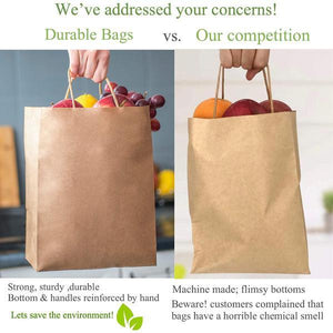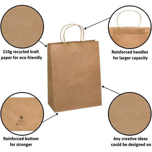 The kraft paper bags are Reusable, Recyclable, Bio-Degradable and Compostable. Use our bulk paper bags with handle, reuse them as many times as you like and then help reduce waste by recycling them.