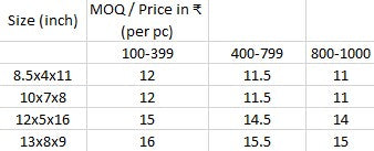 8.5x4x11.5(inch), 10x7x8 (inch), 12x5x16 (inch), 13x8x9 (inch) |