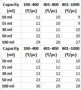 50ml / White / 100pcs - Rs. 2,200.00 50ml / White / 200pcs - Rs. 4,400.00 50ml / White / 300pcs - Rs. 6,600.00 50ml / White / 400pcs - Rs. 8,800.00 50ml / White / 500pcs - Rs. 10,500.00 50ml / White / 600pcs - Rs. 12,600.00 50ml / White / 700pcs - Rs. 14,700.00 50ml / White / 800pcs - Rs. 16,000.00 50ml / White / 900pcs - Rs. 18,000.00 50ml / White / 1000pcs - Rs. 20,000.00 100ml / Black / 100pcs - Rs. 2,900.00 100ml / Black / 200pcs - Rs. 5,800.00 100ml / Black / 300pcs - Rs. 8,700.00 100ml / Black / 400pcs - Rs. 11,600.00 100ml / Black / 500pcs - Rs. 14,000.00 100ml / Black / 600pcs - Rs. 16,800.00 100ml / Black / 700pcs - Rs. 19,600.00 100ml / Black / 800pcs - Rs. 21,600.00 100ml / Black / 900pcs - Rs. 24,300.00 100ml / Black / 1000pcs - Rs. 27,000.00 100ml / Golden / 100pcs - Rs. 3,000.00 100ml / Golden / 200pcs - Rs. 6,000.00 100ml / Golden / 300pcs - Rs. 9,000.00 100ml / Golden / 400pcs - Rs. 12,000.00 100ml / Golden / 500pcs - Rs. 14,500.00 100ml / Golden / 600pcs - Rs. 17,400.00 100ml / Golden / 700pcs - Rs. 20,300.00 100ml / Golden / 800pcs - Rs. 22,400.00 100ml / Golden / 900pcs - Rs. 25,200.00 100ml / Golden / 1000pcs - Rs. 28,000.00 100ml / Silver / 100pcs - Rs. 3,000.00 100ml / Silver / 200pcs - Rs. 6,000.00 100ml / Silver / 300pcs - Rs. 9,000.00 100ml / Silver / 400pcs - Rs. 12,000.00 100ml / Silver / 500pcs - Rs. 14,500.00 100ml / Silver / 600pcs - Rs. 17,400.00 100ml / Silver / 700pcs - Rs. 20,300.00 100ml / Silver / 800pcs - Rs. 22,400.00 100ml / Silver / 900pcs - Rs. 25,200.00 100ml / Silver / 1000pcs - Rs. 28,000.00 100ml / White / 100pcs - Rs. 2,900.00 100ml / White / 200pcs - Rs. 5,800.00 100ml / White / 300pcs - Rs. 8,700.00 100ml / White / 400pcs - Rs. 11,600.00 100ml / White / 500pcs - Rs. 14,000.00 100ml / White / 600pcs - Rs. 16,800.00 100ml / White / 700pcs - Rs. 19,600.00 100ml / White / 800pcs - Rs. 21,600.00 100ml / White / 900pcs - Rs. 24,300.00 100ml / White / 1000pcs - Rs. 27,000.00 30ml / Silver / 100pcs - Rs. 1,300.00 30ml / Silver / 200pcs - Rs. 2,600.00 30ml / Silver / 300pcs - Rs. 3,900.00 30ml / Silver / 400pcs - Rs. 5,200.00 30ml / Silver / 500pcs - Rs. 6,000.00 30ml / Silver / 600pcs - Rs. 7,200.00 30ml / Silver / 700pcs - Rs. 8,400.00 30ml / Silver / 800pcs - Rs. 8,800.00 30ml / Silver / 900pcs - Rs. 9,900.00 30ml / Silver / 1000pcs - Rs. 11,000.00 30ml / White / 100pcs - Rs. 1,200.00 30ml / White / 200pcs - Rs. 2,400.00 30ml / White / 300pcs - Rs. 3,600.00 30ml / White / 400pcs - Rs. 4,800.00 30ml / White / 500pcs - Rs. 5,500.00 30ml / White / 600pcs - Rs. 6,600.00 30ml / White / 700pcs - Rs. 7,700.00 30ml / White / 800pcs - Rs. 8,000.00 30ml / White / 900pcs - Rs. 9,000.00 30ml / White / 1000pcs - Rs. 10,000.00 50ml / Black / 100pcs - Rs. 2,200.00 50ml / Black / 200pcs - Rs. 4,400.00 50ml / Black / 300pcs - Rs. 6,600.00 50ml / Black / 400pcs - Rs. 8,800.00 50ml / Black / 500pcs - Rs. 10,500.00 50ml / Black / 600pcs - Rs. 12,600.00 50ml / Black / 700pcs - Rs. 14,700.00 50ml / Black / 800pcs - Rs. 16,000.00 50ml / Black / 900pcs - Rs. 18,000.00 50ml / Black / 1000pcs - Rs. 20,000.00 50ml / Golden / 100pcs - Rs. 2,300.00 50ml / Golden / 200pcs - Rs. 4,600.00 50ml / Golden / 300pcs - Rs. 6,900.00 50ml / Golden / 400pcs - Rs. 9,200.00 50ml / Golden / 500pcs - Rs. 11,000.00 50ml / Golden / 600pcs - Rs. 13,200.00 50ml / Golden / 700pcs - Rs. 15,400.00 50ml / Golden / 800pcs - Rs. 16,800.00 50ml / Golden / 900pcs - Rs. 18,900.00 50ml / Golden / 1000pcs - Rs. 21,000.00 50ml / Silver / 100pcs - Rs. 2,300.00 50ml / Silver / 200pcs - Rs. 4,600.00 50ml / Silver / 300pcs - Rs. 6,900.00 50ml / Silver / 400pcs - Rs. 9,200.00 50ml / Silver / 500pcs - Rs. 11,000.00 50ml / Silver / 600pcs - Rs. 13,200.00 50ml / Silver / 700pcs - Rs. 15,400.00 50ml / Silver / 800pcs - Rs. 16,800.00 50ml / Silver / 900pcs - Rs. 18,900.00 50ml / Silver / 1000pcs - Rs. 21,000.00 15ml / Golden / 100pcs - Rs. 1,200.00 15ml / Golden / 200pcs - Rs. 2,400.00 15ml / Golden / 300pcs - Rs. 3,600.00 15ml / Golden / 400pcs - Rs. 4,800.00 15ml / Golden / 500pcs - Rs. 5,500.00 15ml / Golden / 600pcs - Rs. 6,600.00 15ml / Golden / 700pcs - Rs. 7,700.00 15ml / Golden / 800pcs - Rs. 8,000.00 15ml / Golden / 900pcs - Rs. 9,000.00 15ml / Golden / 1000pcs - Rs. 10,000.00 15ml / Silver / 100pcs - Rs. 1,200.00 15ml / Silver / 200pcs - Rs. 2,400.00 15ml / Silver / 300pcs - Rs. 3,600.00 15ml / Silver / 400pcs - Rs. 4,800.00 15ml / Silver / 500pcs - Rs. 5,500.00 15ml / Silver / 600pcs - Rs. 6,600.00 15ml / Silver / 700pcs - Rs. 7,700.00 15ml / Silver / 800pcs - Rs. 8,000.00 15ml / Silver / 900pcs - Rs. 9,000.00 15ml / Silver / 1000pcs - Rs. 10,000.00 15ml / White / 100pcs - Rs. 1,100.00 15ml / White / 200pcs - Rs. 2,200.00 15ml / White / 300pcs - Rs. 3,300.00 15ml / White / 400pcs - Rs. 4,400.00 15ml / White / 500pcs - Rs. 5,000.00 15ml / White / 600pcs - Rs. 6,000.00 15ml / White / 700pcs - Rs. 7,000.00 15ml / White / 800pcs - Rs. 7,200.00 15ml / White / 900pcs - Rs. 8,100.00 15ml / White / 1000pcs - Rs. 9,000.00 30ml / Black / 100pcs - Rs. 1,200.00 30ml / Black / 200pcs - Rs. 2,400.00 30ml / Black / 300pcs - Rs. 3,600.00 30ml / Black / 400pcs - Rs. 4,800.00 30ml / Black / 500pcs - Rs. 5,500.00 30ml / Black / 600pcs - Rs. 6,600.00 30ml / Black / 700pcs - Rs. 7,700.00 30ml / Black / 800pcs - Rs. 8,000.00 30ml / Black / 900pcs - Rs. 9,000.00 30ml / Black / 1000pcs - Rs. 10,000.00 30ml / Golden / 100pcs - Rs. 1,300.00 30ml / Golden / 200pcs - Rs. 2,600.00 30ml / Golden / 300pcs - Rs. 3,900.00 30ml / Golden / 400pcs - Rs. 5,200.00 30ml / Golden / 500pcs - Rs. 6,000.00 30ml / Golden / 600pcs - Rs. 7,200.00 30ml / Golden / 700pcs - Rs. 8,400.00 30ml / Golden / 800pcs - Rs. 8,800.00 30ml / Golden / 900pcs - Rs. 9,900.00 30ml / Golden / 1000pcs - Rs. 11,000.00 10ml / Black / 100pcs - Rs. 1,100.00 10ml / Black / 200pcs - Rs. 2,200.00 10ml / Black / 300pcs - Rs. 3,300.00 10ml / Black / 400pcs - Rs. 4,400.00 10ml / Black / 500pcs - Rs. 5,000.00 10ml / Black / 600pcs - Rs. 6,000.00 10ml / Black / 700pcs - Rs. 7,000.0