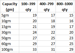 5g, 10gm, 15gm, 30gm, 50gm, 60gm, 100gm, 250gm