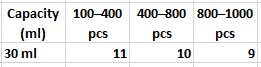 100pcs, 200pcs, 300pcs, 400pcs, 500pcs, 600pcs, 700pcs, 800pcs, 900pcs, 1000pcs |