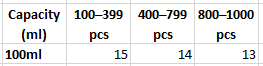 100pcs, 200pcs, 300pcs, 400pcs, 500pcs, 600pcs, 700pcs, 800pcs, 900pcs, 1000pcs |