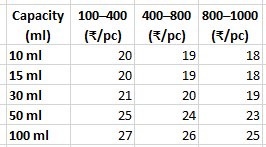 100ml / 100pcs / Black - Rs. 2,700.00 100ml / 100pcs / white - Rs. 2,700.00 100ml / 200pcs / Black - Rs. 5,400.00 100ml / 200pcs / white - Rs. 5,400.00 100ml / 300pcs / Black - Rs. 8,100.00 100ml / 300pcs / white - Rs. 8,100.00 100ml / 400pcs / Black - Rs. 10,800.00 100ml / 400pcs / white - Rs. 10,800.00 100ml / 500pcs / Black - Rs. 13,000.00 100ml / 500pcs / white - Rs. 13,000.00 100ml / 600pcs / Black - Rs. 15,600.00 100ml / 600pcs / white - Rs. 15,600.00 100ml / 700pcs / Black - Rs. 18,200.00 100ml / 700pcs / white - Rs. 18,200.00 100ml / 800pcs / Black - Rs. 20,000.00 100ml / 800pcs / white - Rs. 20,000.00 100ml / 900pcs / Black - Rs. 22,500.00 100ml / 900pcs / white - Rs. 22,500.00 100ml / 1000pcs / Black - Rs. 25,000.00 100ml / 1000pcs / white - Rs. 25,000.00 10ml / 100pcs / Black - Rs. 2,000.00 10ml / 100pcs / white - Rs. 2,000.00 10ml / 200pcs / Black - Rs. 4,000.00 10ml / 200pcs / white - Rs. 4,000.00 10ml / 300pcs / Black - Rs. 6,000.00 10ml / 300pcs / white - Rs. 6,000.00 10ml / 400pcs / Black - Rs. 8,000.00 10ml / 400pcs / white - Rs. 8,000.00 10ml / 500pcs / Black - Rs. 9,500.00 10ml / 500pcs / white - Rs. 9,500.00 10ml / 600pcs / Black - Rs. 11,400.00 10ml / 600pcs / white - Rs. 11,400.00 10ml / 700pcs / Black - Rs. 13,300.00 10ml / 700pcs / white - Rs. 13,300.00 10ml / 800pcs / Black - Rs. 14,400.00 10ml / 800pcs / white - Rs. 14,400.00 10ml / 900pcs / Black - Rs. 16,200.00 10ml / 900pcs / white - Rs. 16,200.00 10ml / 1000pcs / Black - Rs. 18,000.00 10ml / 1000pcs / white - Rs. 18,000.00 15ml / 100pcs / Black - Rs. 2,000.00 15ml / 100pcs / white - Rs. 2,000.00 15ml / 200pcs / Black - Rs. 4,000.00 15ml / 200pcs / white - Rs. 4,000.00 15ml / 300pcs / Black - Rs. 6,000.00 15ml / 300pcs / white - Rs. 6,000.00 15ml / 400pcs / Black - Rs. 8,000.00 15ml / 400pcs / white - Rs. 8,000.00 15ml / 500pcs / Black - Rs. 9,500.00 15ml / 500pcs / white - Rs. 9,500.00 15ml / 600pcs / Black - Rs. 11,400.00 15ml / 600pcs / white - Rs. 11,400.00 15ml / 700pcs / Black - Rs. 13,300.00 15ml / 700pcs / white - Rs. 13,300.00 15ml / 800pcs / Black - Rs. 14,400.00 15ml / 800pcs / white - Rs. 14,400.00 15ml / 900pcs / Black - Rs. 16,200.00 15ml / 900pcs / white - Rs. 16,200.00 15ml / 1000pcs / Black - Rs. 18,000.00 15ml / 1000pcs / white - Rs. 18,000.00 30ml / 100pcs / Black - Rs. 2,100.00 30ml / 100pcs / white - Rs. 2,100.00 30ml / 200pcs / Black - Rs. 4,200.00 30ml / 200pcs / white - Rs. 4,200.00 30ml / 300pcs / Black - Rs. 6,300.00 30ml / 300pcs / white - Rs. 6,300.00 30ml / 400pcs / Black - Rs. 8,400.00 30ml / 400pcs / white - Rs. 8,400.00 30ml / 500pcs / Black - Rs. 10,000.00 30ml / 500pcs / white - Rs. 10,000.00 30ml / 600pcs / Black - Rs. 12,000.00 30ml / 600pcs / white - Rs. 12,000.00 30ml / 700pcs / Black - Rs. 14,000.00 30ml / 700pcs / white - Rs. 14,000.00 30ml / 800pcs / Black - Rs. 15,200.00 30ml / 800pcs / white - Rs. 15,200.00 30ml / 900pcs / Black - Rs. 17,100.00 30ml / 900pcs / white - Rs. 17,100.00 30ml / 1000pcs / Black - Rs. 19,000.00 30ml / 1000pcs / white - Rs. 19,000.00 50ml / 100pcs / Black - Rs. 2,500.00 50ml / 100pcs / white - Rs. 2,500.00 50ml / 200pcs / Black - Rs. 5,000.00 50ml / 200pcs / white - Rs. 5,000.00 50ml / 300pcs / Black - Rs. 7,500.00 50ml / 300pcs / white - Rs. 7,500.00 50ml / 400pcs / Black - Rs. 10,000.00 50ml / 400pcs / white - Rs. 10,000.00 50ml / 500pcs / Black - Rs. 12,000.00 50ml / 500pcs / white - Rs. 12,000.00 50ml / 600pcs / Black - Rs. 14,400.00 50ml / 600pcs / white - Rs. 14,400.00 50ml / 700pcs / Black - Rs. 16,800.00 50ml / 700pcs / white - Rs. 16,800.00 50ml / 800pcs / Black - Rs. 18,400.00 50ml / 800pcs / white - Rs. 18,400.00 50ml / 900pcs / Black - Rs. 20,700.00 50ml / 900pcs / white - Rs. 20,700.00 50ml / 1000pcs / Black - Rs. 23,000.00 50ml / 1000pcs / white - Rs. 23,000.00