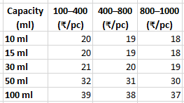 100ml / 100pcs / Black - Rs. 3,900.00 100ml / 100pcs / white - Rs. 3,900.00 100ml / 200pcs / Black - Rs. 7,800.00 100ml / 200pcs / white - Rs. 7,800.00 100ml / 300pcs / Black - Rs. 11,700.00 100ml / 300pcs / white - Rs. 11,700.00 100ml / 400pcs / Black - Rs. 15,600.00 100ml / 400pcs / white - Rs. 15,600.00 100ml / 500pcs / Black - Rs. 19,000.00 100ml / 500pcs / white - Rs. 19,000.00 100ml / 600pcs / Black - Rs. 22,800.00 100ml / 600pcs / white - Rs. 22,800.00 100ml / 700pcs / Black - Rs. 26,600.00 100ml / 700pcs / white - Rs. 26,600.00 100ml / 800pcs / Black - Rs. 29,600.00 100ml / 800pcs / white - Rs. 29,600.00 100ml / 900pcs / Black - Rs. 33,300.00 100ml / 900pcs / white - Rs. 33,300.00 100ml / 1000pcs / Black - Rs. 37,000.00 100ml / 1000pcs / white - Rs. 37,000.00 10ml / 100pcs / Black - Rs. 2,000.00 10ml / 100pcs / white - Rs. 2,000.00 10ml / 200pcs / Black - Rs. 4,000.00 10ml / 200pcs / white - Rs. 4,000.00 10ml / 300pcs / Black - Rs. 6,000.00 10ml / 300pcs / white - Rs. 6,000.00 10ml / 400pcs / Black - Rs. 8,000.00 10ml / 400pcs / white - Rs. 8,000.00 10ml / 500pcs / Black - Rs. 9,500.00 10ml / 500pcs / white - Rs. 9,500.00 10ml / 600pcs / Black - Rs. 11,400.00 10ml / 600pcs / white - Rs. 11,400.00 10ml / 700pcs / Black - Rs. 13,300.00 10ml / 700pcs / white - Rs. 13,300.00 10ml / 800pcs / Black - Rs. 14,400.00 10ml / 800pcs / white - Rs. 14,400.00 10ml / 900pcs / Black - Rs. 16,200.00 10ml / 900pcs / white - Rs. 16,200.00 10ml / 1000pcs / Black - Rs. 18,000.00 10ml / 1000pcs / white - Rs. 18,000.00 15ml / 100pcs / Black - Rs. 2,000.00 15ml / 100pcs / white - Rs. 2,000.00 15ml / 200pcs / Black - Rs. 4,000.00 15ml / 200pcs / white - Rs. 4,000.00 15ml / 300pcs / Black - Rs. 6,000.00 15ml / 300pcs / white - Rs. 6,000.00 15ml / 400pcs / Black - Rs. 8,000.00 15ml / 400pcs / white - Rs. 8,000.00 15ml / 500pcs / Black - Rs. 9,500.00 15ml / 500pcs / white - Rs. 9,500.00 15ml / 600pcs / Black - Rs. 11,400.00 15ml / 600pcs / white - Rs. 11,400.00 15ml / 700pcs / Black - Rs. 13,300.00 15ml / 700pcs / white - Rs. 13,300.00 15ml / 800pcs / Black - Rs. 14,400.00 15ml / 800pcs / white - Rs. 14,400.00 15ml / 900pcs / Black - Rs. 16,200.00 15ml / 900pcs / white - Rs. 16,200.00 15ml / 1000pcs / Black - Rs. 18,000.00 15ml / 1000pcs / white - Rs. 18,000.00 30ml / 100pcs / Black - Rs. 2,100.00 30ml / 100pcs / white - Rs. 2,100.00 30ml / 200pcs / Black - Rs. 4,200.00 30ml / 200pcs / white - Rs. 4,200.00 30ml / 300pcs / Black - Rs. 6,300.00 30ml / 300pcs / white - Rs. 6,300.00 30ml / 400pcs / Black - Rs. 8,400.00 30ml / 400pcs / white - Rs. 8,400.00 30ml / 500pcs / Black - Rs. 10,000.00 30ml / 500pcs / white - Rs. 10,000.00 30ml / 600pcs / Black - Rs. 12,000.00 30ml / 600pcs / white - Rs. 12,000.00 30ml / 700pcs / Black - Rs. 14,000.00 30ml / 700pcs / white - Rs. 14,000.00 30ml / 800pcs / Black - Rs. 15,200.00 30ml / 800pcs / white - Rs. 15,200.00 30ml / 900pcs / Black - Rs. 17,100.00 30ml / 900pcs / white - Rs. 17,100.00 30ml / 1000pcs / Black - Rs. 19,000.00 30ml / 1000pcs / white - Rs. 19,000.00 50ml / 100pcs / Black - Rs. 3,200.00 50ml / 100pcs / white - Rs. 3,200.00 50ml / 200pcs / Black - Rs. 6,400.00 50ml / 200pcs / white - Rs. 6,400.00 50ml / 300pcs / Black - Rs. 9,600.00 50ml / 300pcs / white - Rs. 9,600.00 50ml / 400pcs / Black - Rs. 12,800.00 50ml / 400pcs / white - Rs. 12,800.00 50ml / 500pcs / Black - Rs. 15,500.00 50ml / 500pcs / white - Rs. 15,500.00 50ml / 600pcs / Black - Rs. 18,600.00 50ml / 600pcs / white - Rs. 18,600.00 50ml / 700pcs / Black - Rs. 21,700.00 50ml / 700pcs / white - Rs. 21,700.00 50ml / 800pcs / Black - Rs. 24,000.00 50ml / 800pcs / white - Rs. 24,000.00 50ml / 900pcs / Black - Rs. 27,000.00 50ml / 900pcs / white - Rs. 27,000.00 50ml / 1000pcs / Black - Rs. 30,000.00 50ml / 1000pcs / white - Rs. 30,000.00