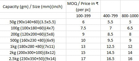 50g, 100g, 200g, 500g, 1000g, 2000g (2kg), 2500g |