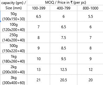 50g, 100g, 250g, 500g, 1000g (1kg), 2000g (2kg), 3000g (3kg) |