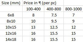 6x8, 8x10, 10x15, 12x16, 14x18 |