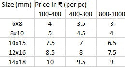 6x8, 8x10, 10x15, 12x16, 14x18 |