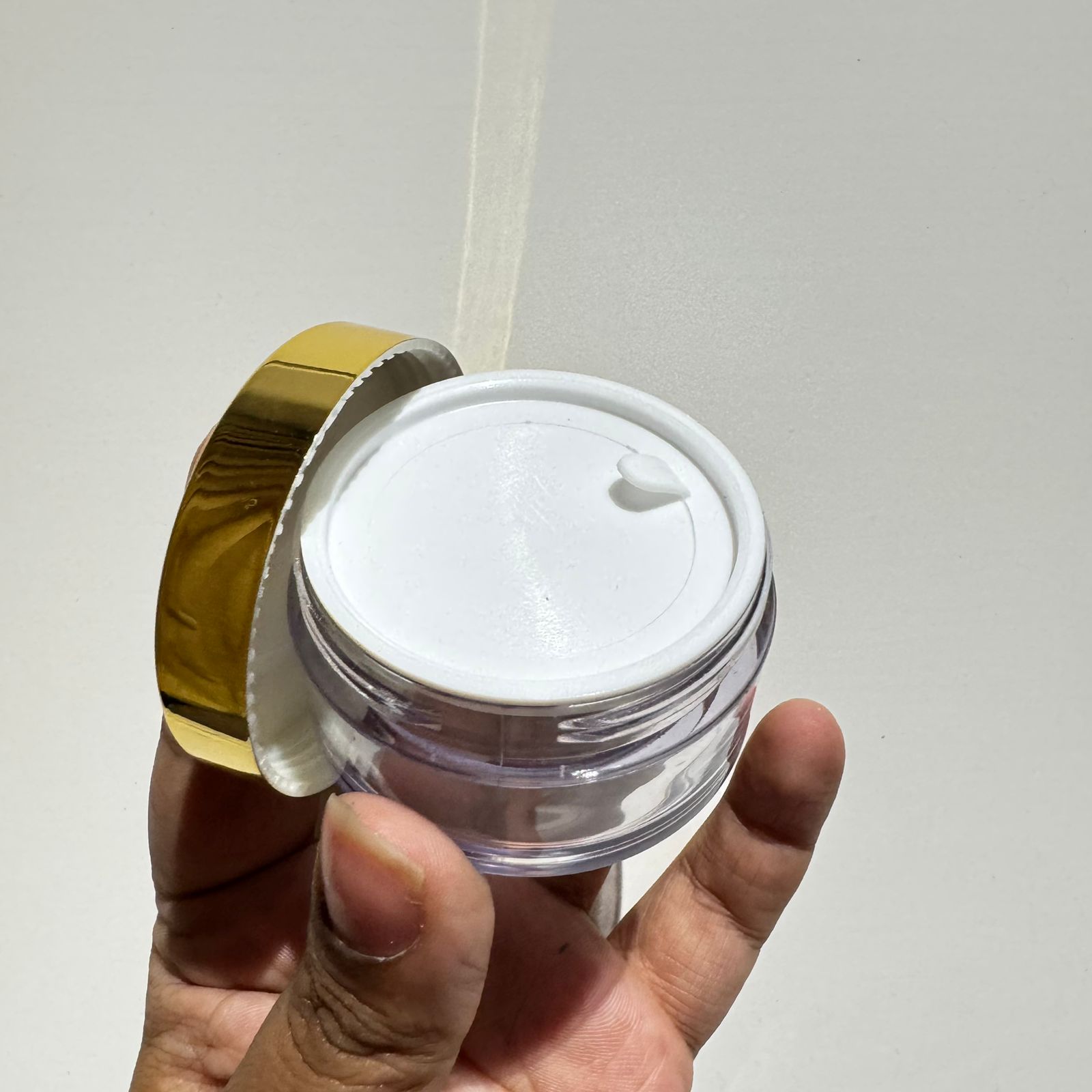 Acrylic San Jars with Golden and white inner cap fits for lip balms and body butter and for other skin care products, small and convenient to carry cosmetic products.